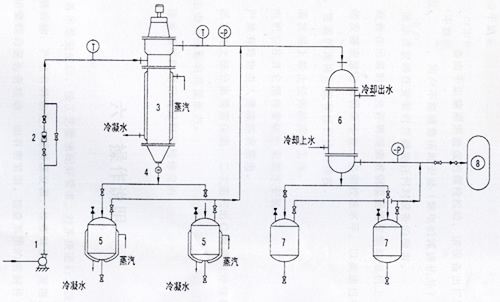 1 進料泵  2 流量計  3 薄膜蒸發(fā)器 4 視鏡  5 濃縮液接受罐  6 冷凝器 7 冷凝液接受罐 8 真空泵